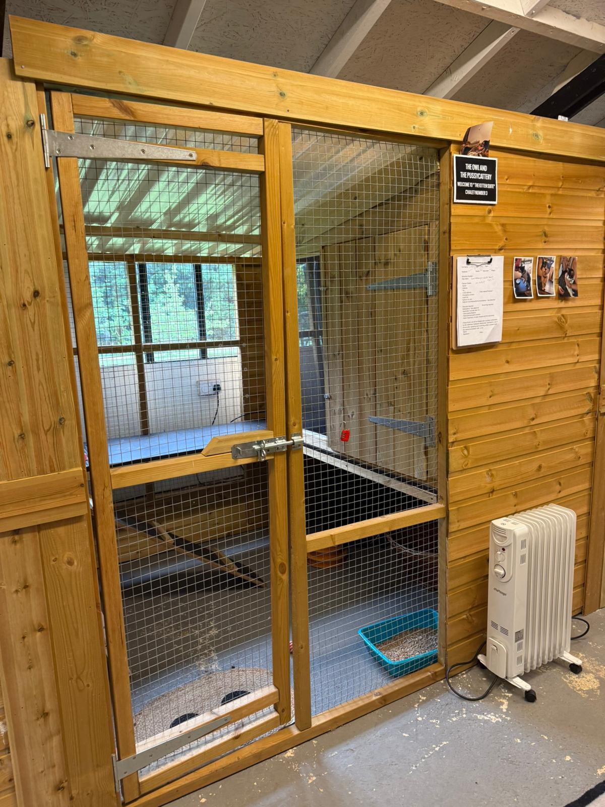 Each unit is light and welcoming, with a large window at the back to let in natural sunlight. At the front, you’ll see a comfortable space for your cat to relax, along with a clearly displayed checklist board where we record their care and wellbeing throughout the day. The cattery is fully heated, ensuring every unit stays warm and cosy during the cooler months.